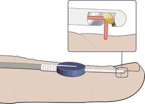 Entdecken Sie die Vorteile: Der patentierte Applikator der RJ-LightNeedle lenkt den Laserstrahl so um, dass er stets senkrecht auf den Behandlungspunkt fällt. Der Applikator wird kostengünstig mit einem normalen Pflaster in beliebiger Lage auf der Haut fixiert.